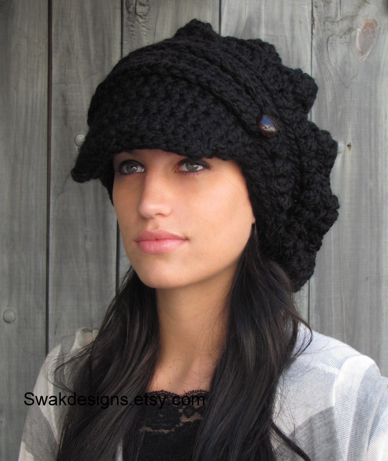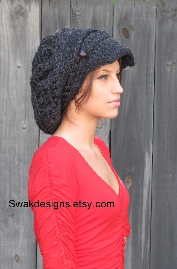 Black Slouchy Hat Womens Hat Two Button Band Newsboy Cap Handmade Chunky Hat or CHOOSE color Best Seller