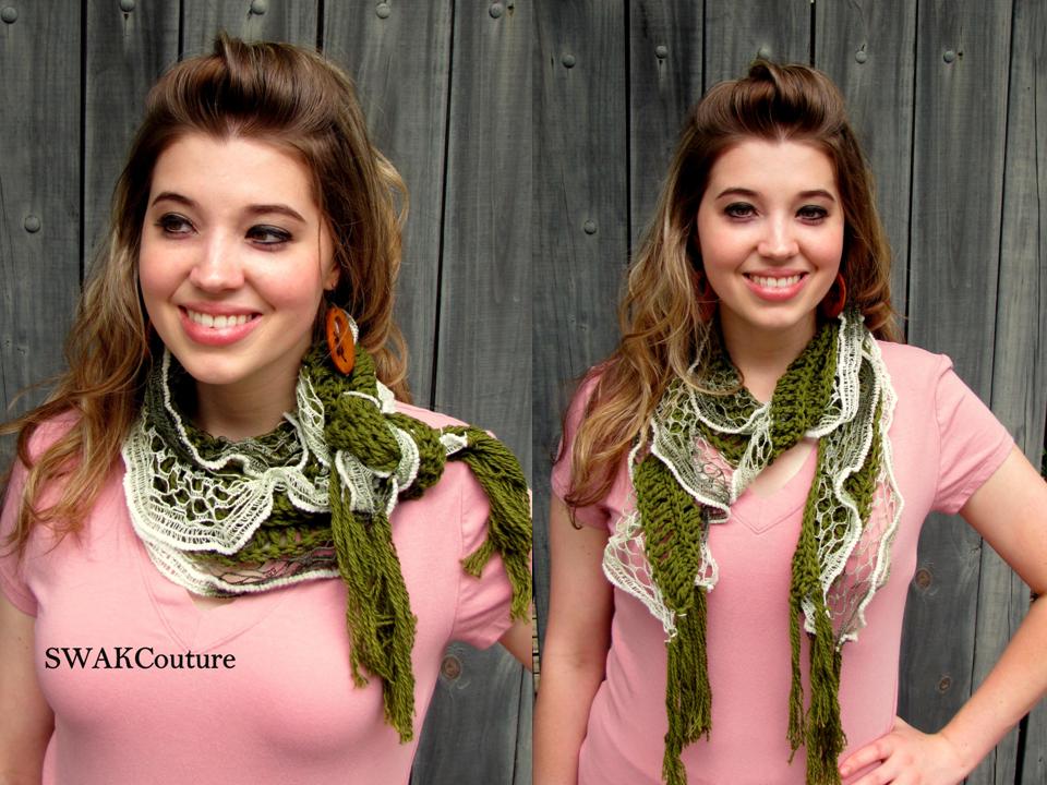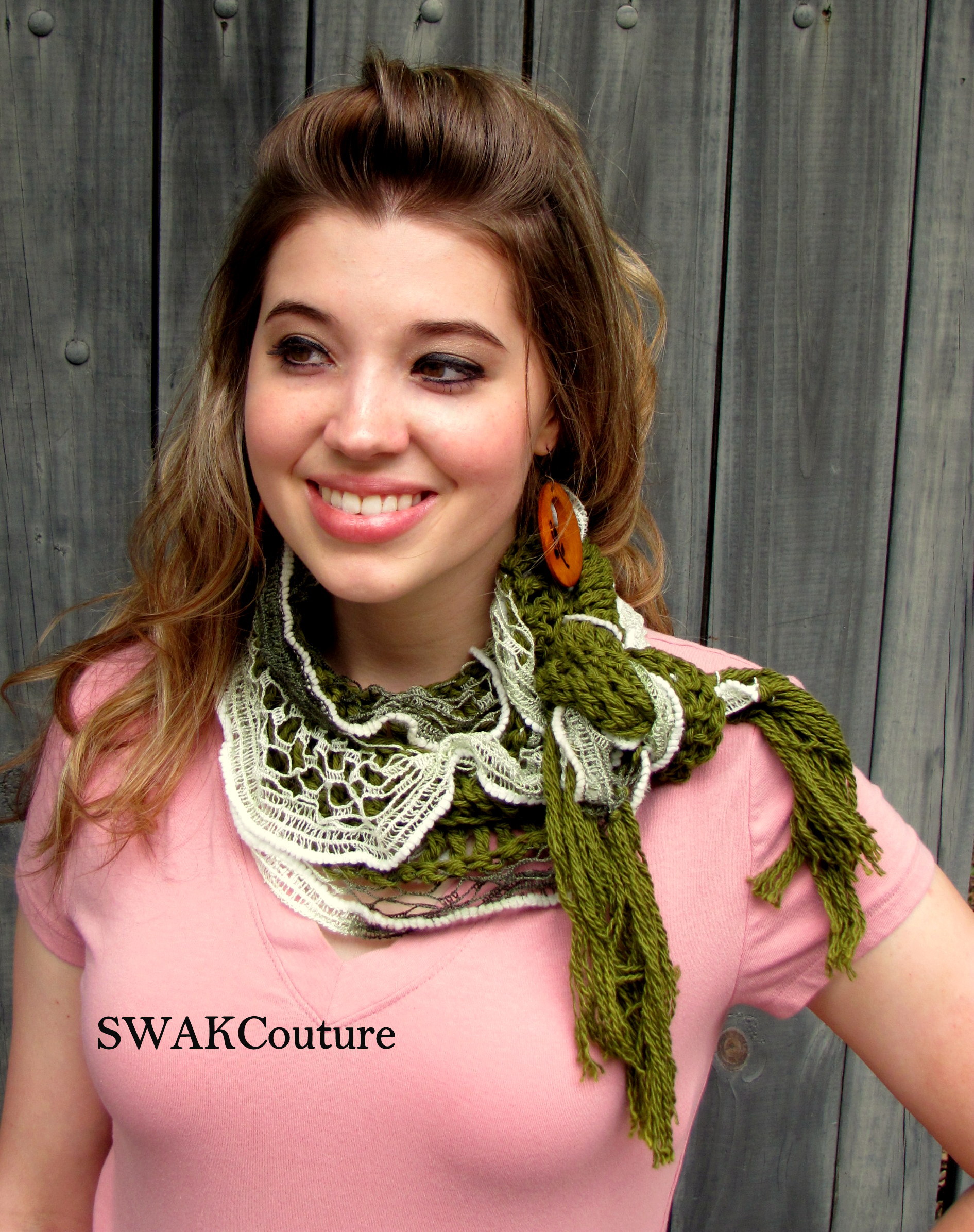 Shabby Chic Lace Cotton Scarf Summer Lightweight Scarf Olive Green & Cream