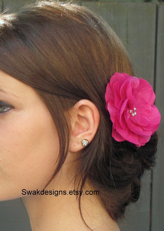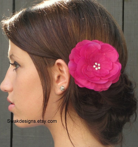 ~~ This beautiful and fluffy Peony Blossom Hair Comb is handmade with Six layers of Fuschia Pink Silk with some organza layers mixed in and centered with Sparkling Rhinestones (Freshwater ivory Pearls available upon request).